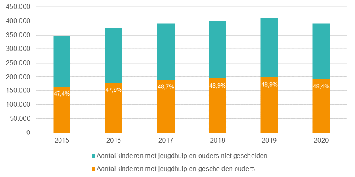Uit een uitgebreid onderzoek over de relatie tussen scheidingen, GGZ-gebruik en jeugdzorggebruik, uitgevoerd in opdracht van het Ministerie van VWS, blijkt dat het aandeel kinderen van gescheiden ouders met jeugdhulp binnen het totale aantal kinderen met jeugdhulp van jaar tot jaar iets groter wordt. ‘In onderstaand figuur is te zien dat het percentage kinderen van gescheiden ouders met jeugdhulp in de periode 2015 – 2020 langzaam is gestegen van 47,4% in 2015 naar 49,4% in 2020’.