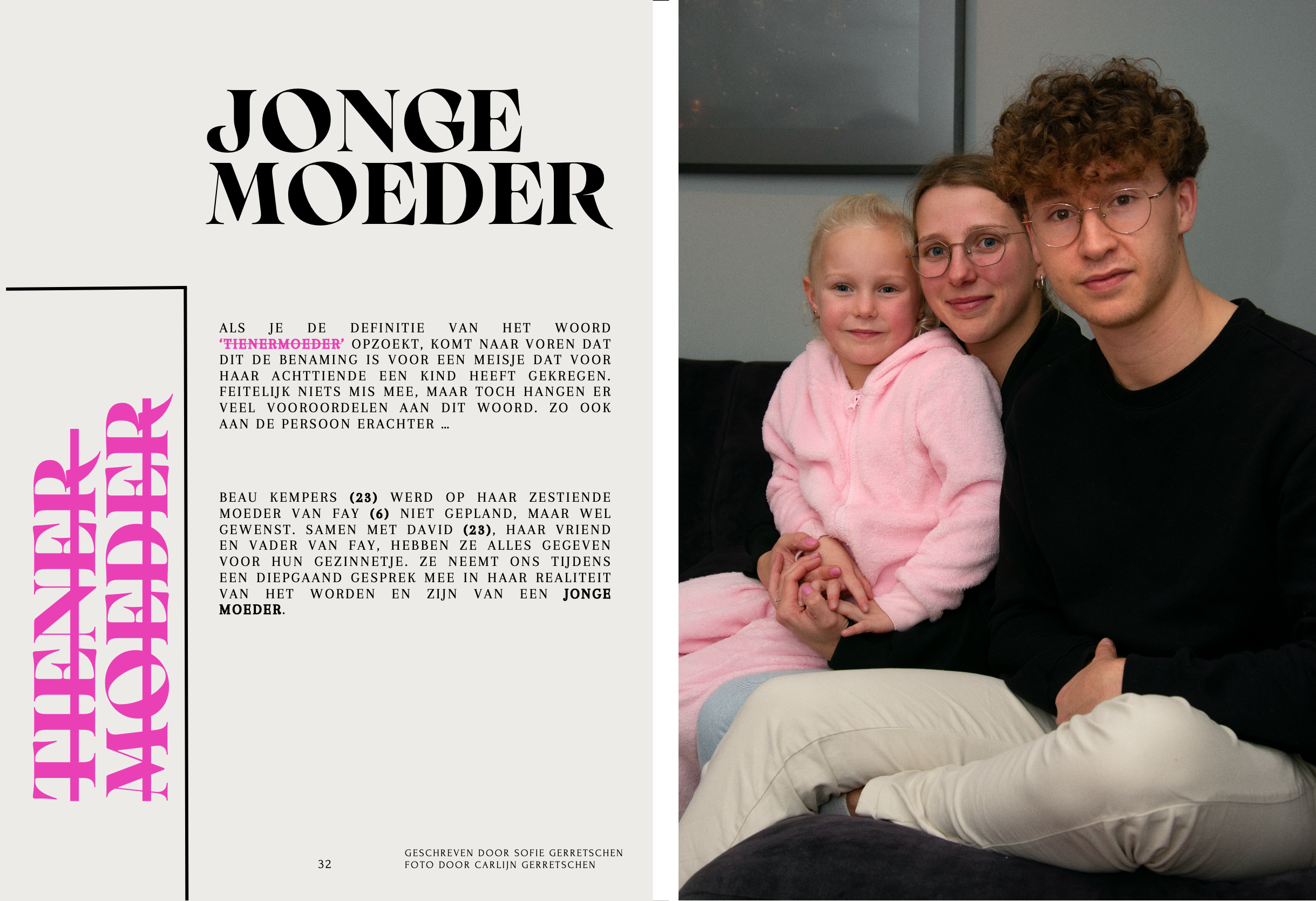 Het interview verliep volgens Sofie heel soepel. ‘We hadden het interview bij de jonge moeder, Beau Kempers, thuis gedaan. Ik heb het idee dat bronnen meer durven te openen als ze in een vertrouwde omgeving zijn.’ Tijdens het interview waren het dochtertje en de vriend van Beau ook thuis. ‘Dat liet meteen zien hoe hecht ze met z’n drieën zijn. Ik heb veel geleerd van dit project, zeker omdat dit het eerste persoonlijke interview is dat ik ooit heb gehouden.’