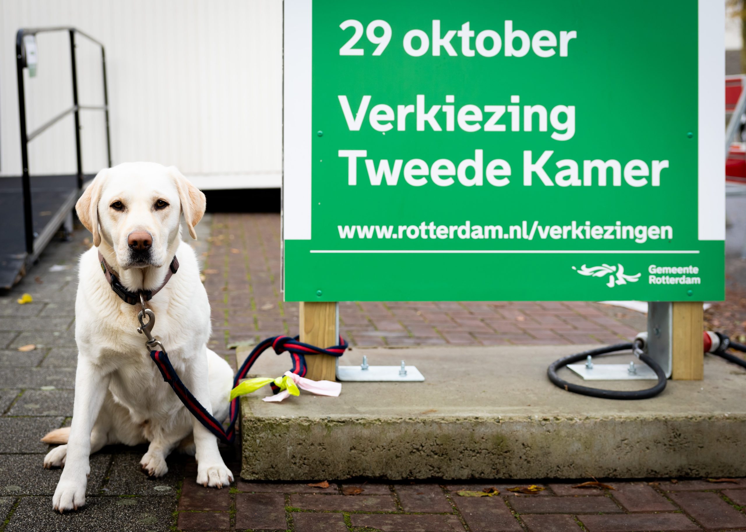 Hond wacht bij stemhokje in Rotterdam Foto: Iris van den Broek ANP