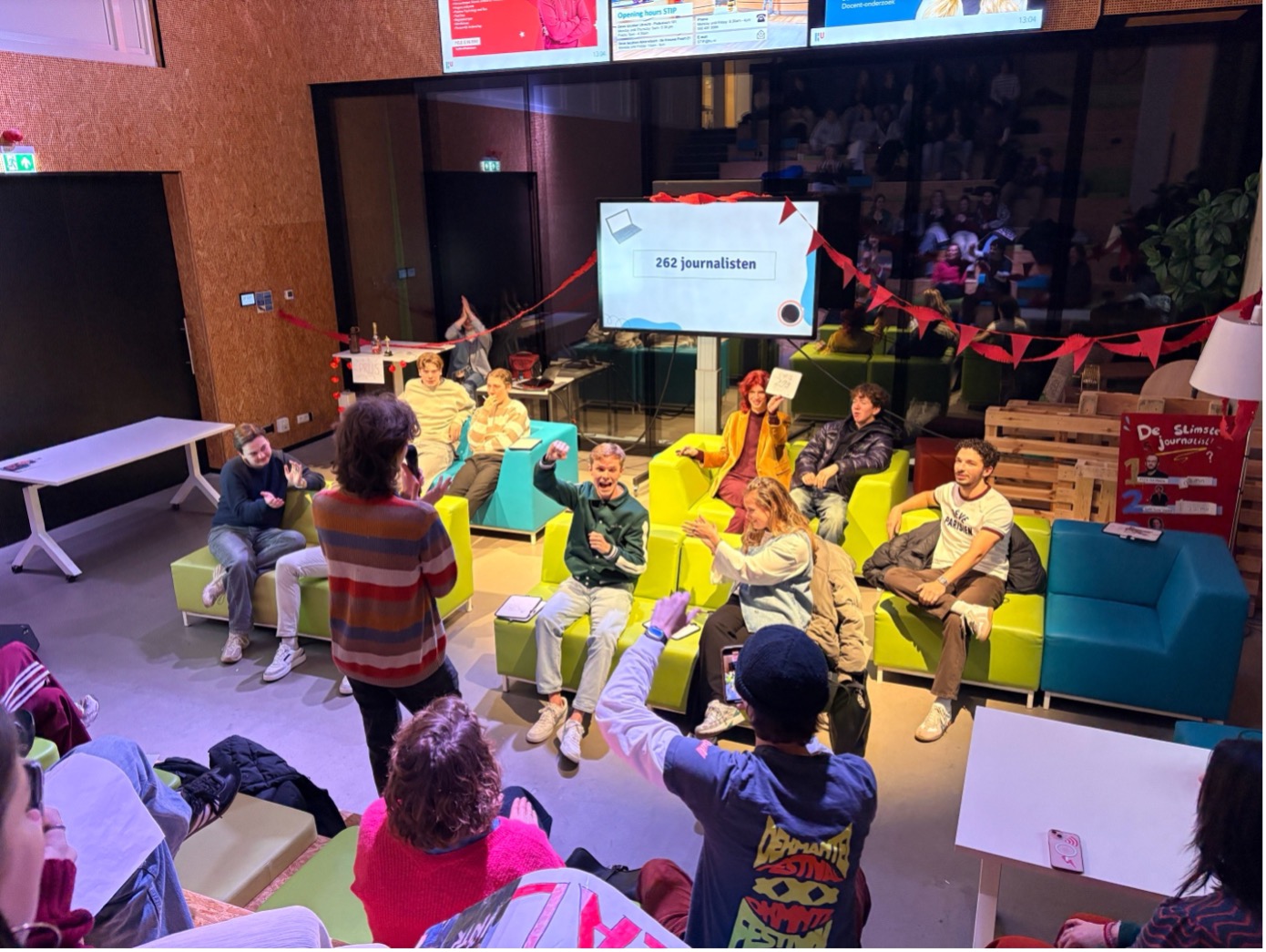 Het hele schooljaar hebben de studenten in de eerstejaarsklassen elke week onderling tegen elkaar gestreden. Vandaag, donderdag 15 januari, namen de klassenwinnaars het tegen ekaar op. In de lunchpauze op het volle Mediaplein hebben ze onder luid gejuich tientallen vragen beantwoord over het nieuws van 2025.