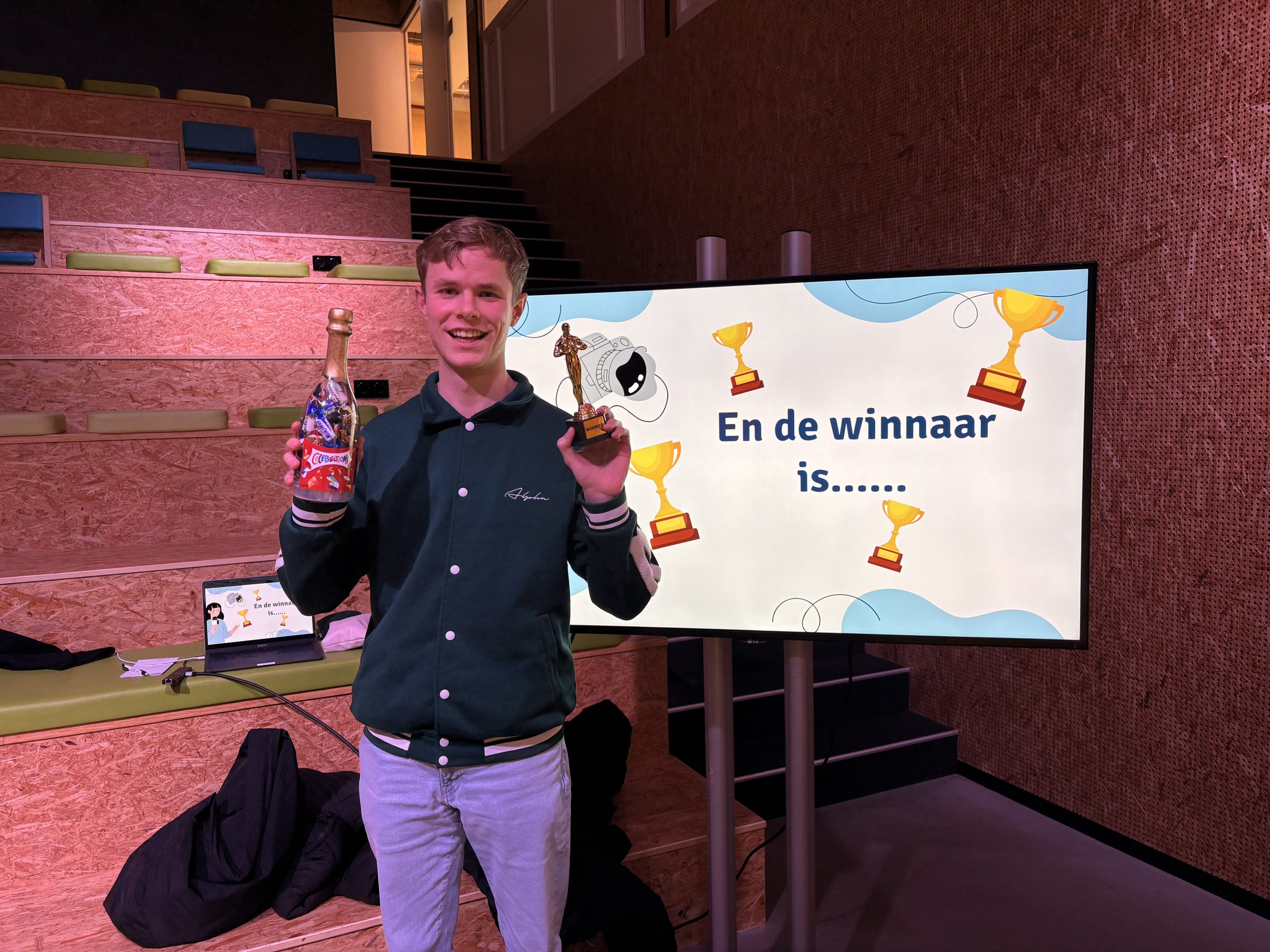Jip van den Brink is de nieuwe nieuwskamioen van de eerstejaars studenten Foto: Max van den Bogaert