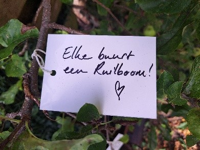 De ruilboom is erg populair. Elke dag ziet Geert er wel een voorbijganger een appel plukken en een wens ophangen. Mensen van alle leeftijden schrijven de wensen op een kaartje. “Er hangen al 2 kaartjes in van kinderen, eentje heeft een hele schattige tekening erbij gemaakt”, aldus Geert. Een voorbijganger besluit ook een wens te doen. ‘Dat iedereen mag bereiken wat die wilt bereiken’ is haar wens. “Want iedereen verdient het om gelukkig te zijn”, licht zij toe. Benieuwd naar de wensen in de ruilboom? Bekijk dan hier de facebookpagina: