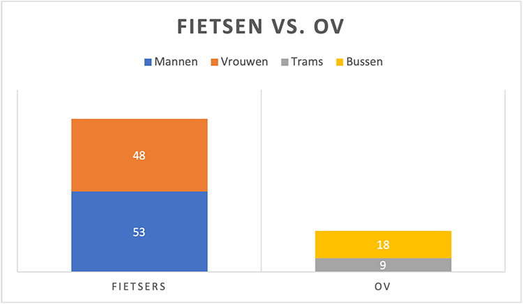 Om niet alleen de fietsende vrouwen in de spotlight te zetten, verdiepen we ons ook in de studenten die met het OV gaan. Wellicht stond je deze week in die overvolle tram naar Utrecht Science Park. Je was niet de enige. Tijdens ons onderzoek geeft 45% van de studenten aan gebruik te maken van het OV. Ze doen dit vooral, omdat ze het makkelijker vinden en de reistijd vaak korter is. Voor 25% van deze groep is het niet realistisch om de school op de fiets te bereiken. Veel OV-reizigers geven aan op de te fiets stappen, als afstand geen rol zou spelen in hun beslissing. Een kwart van de OV-reizigers zegt soms al gebruik te maken van de fiets.