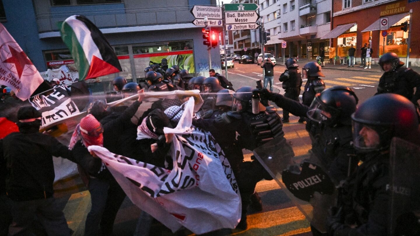 De menigte trekt door de straten en probeert blokkades te doorbreken. De confrontatie begint wanneer twee mannen met Israëlische vlaggen op de betogers afstormen. De politie treedt op met linies, schilden en waarschuwingsoproepen. Wanneer demonstranten te dicht bij tegenbetogers met Israëlische vlaggen komen, grijpen agenten hard in. Op hoogte van hammerstrasse komt traangas van pas, er worden klappen uitgedeeld en een waterkanon wordt ingezet om de demonstranten op afstand te houden.