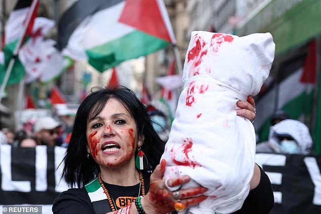 Rond het middaguur verzamelen groepen demonstranten zich in de binnenstad. Ze zwaaien met Palestijnse vlaggen, dragen borden met teksten als “No Music for Murder” en “Singing while Gaza Burns”. Sommigen steken Israëlische en Amerikaanse vlaggen in brand en anderen steken rood- en groen gekleurde rookbommen af. Een activist van BDS (Boycot, Desinvestering en Sancties)  met een rood geschminkt gezicht draagt een bloederig bundeltje stof, of iets wat daarop lijkt, dat staat voor de stervende kinderen in de oorlog met Gaza.