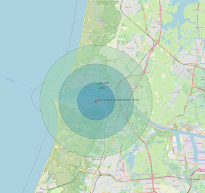 Cirkels met een straal van 1, 3 en 5 kilometer rond de sensor en de locaties van Tata Steel en ENCI. Kaart gemaakt met QGIS.