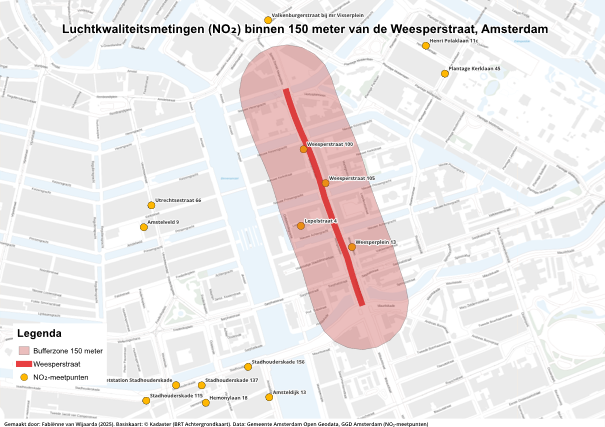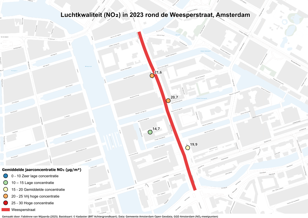 In QGIS is een buffer van 150 meter rond de Weesperstraat gemaakt om alleen de meetpunten in de directe omgeving te selecteren. Deze zone is weergegeven op de bufferkaart. De kaarten tonen de gemiddelde NO₂-waarden per jaar, ingedeeld in intervallen van 5 µg/m³. Ook de kaart van 2023 is in de analyse meegenomen, maar niet direct in het artikel opgenomen.