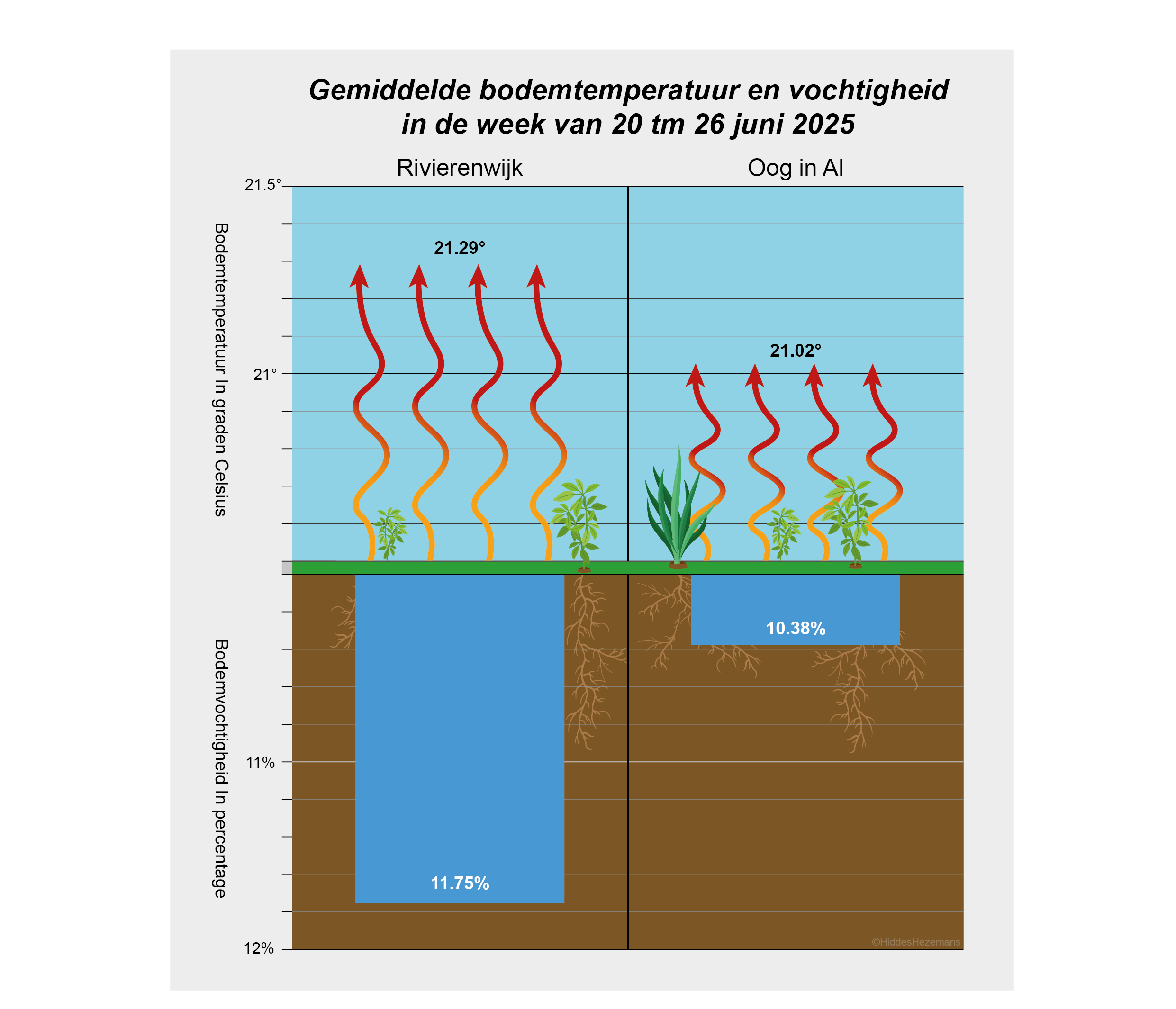 Wanneer de gegevens van een warme meetweek in juni naast elkaar worden gelegd, zijn er een aantal verschillen tussen Rivierenwijk en Oog in Al te zien. In Rivierenwijk meten de sensoren een gemiddelde bodemtemperatuur van ruim 21,29 °C en een bodemvochtigheid van gemiddeld 11,75%. In Oog in Al is dat gemiddeld 21,02 °C en 10,38% vochtigheid.
