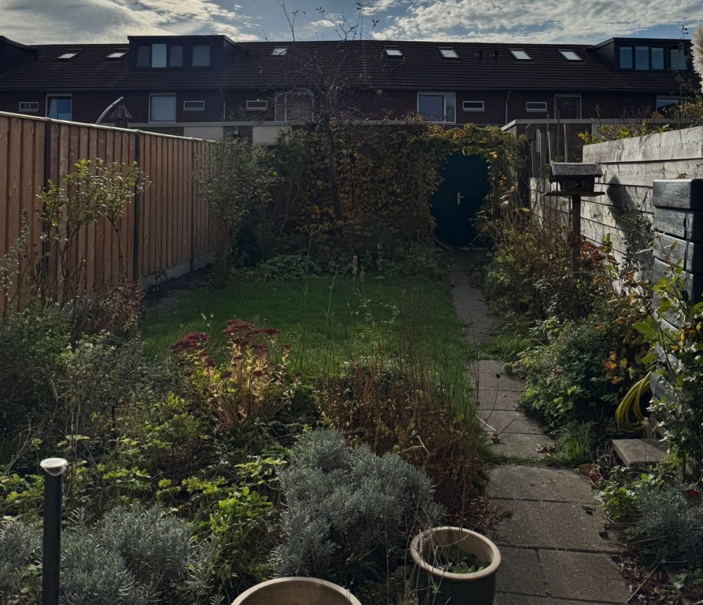 Wanneer de zomertemperaturen oplopen, voelt Van Schootens tuin vooral benauwd en warm aan. De stenen voor in de tuin houden de warmte langer vast dan ze prettig vindt. De planten achterin, samen met de schaduw van de boom en het tuinhuisje, maken de achterkant van de tuin koeler. “Sinds ik in Rivierenwijk woon, merk ik dat ik in de zomer binnen ga zitten als het warm is”, vertelt ze. “Het is hier dan veel te heet buiten.”