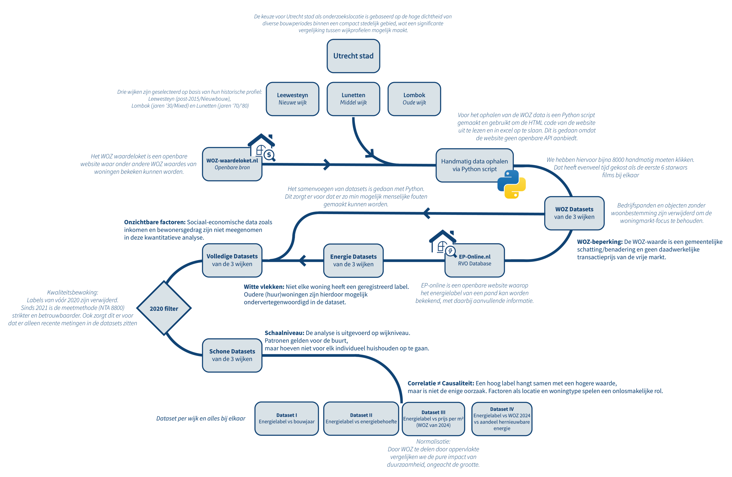 De visualisatie hieronder toont de route die wij hebben afgelegd. Het is geen rechte lijn van A naar B, maar een proces van delven, filteren en poetsen. Omdat essentiële gegevens zoals de WOZ-waarde niet via een openbare manier (API) beschikbaar waren, bouwden we onze eigen digitale gereedschappen. Een speciaal geschreven Python-script moest aan de slag om handmatig data te oogsten.