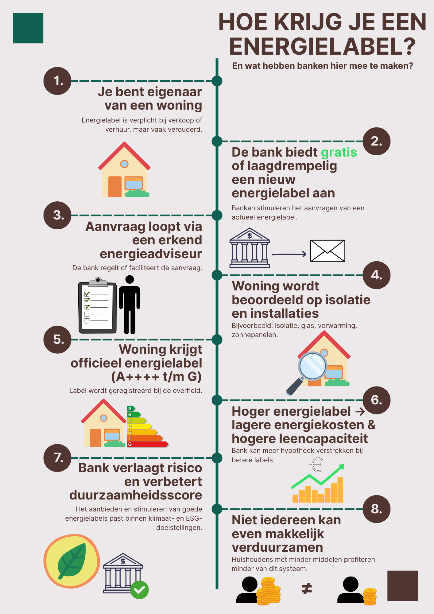 Het aanbieden van gratis energielabels en verduurzamingsadvies is daarmee een strategische keuze: het verlaagt risico’s, vergroot de hoeveelheid die geleend kan worden en draagt bij aan de duurzaamheidsdoelen van de bank. Het is dan ook een klassiek voorbeeld van greenwashen, banken geven veel om het halen van hun duurzaamheidsdoelstellingen en veel minder aan het gevolg en belang van hun klanten.