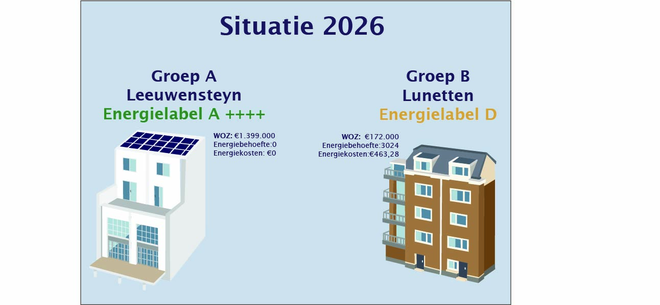 Groep A woont in Leeuwensteyn. Het gezin bezit een nieuwe woning met energielabel A++++. De woning is volledig verduurzaamd: goede isolatie, zonnepanelen en een energiezuinig verwarmingssysteem. De energierekening is 0 euro per jaar en blijft dat ook in de komende jaren.