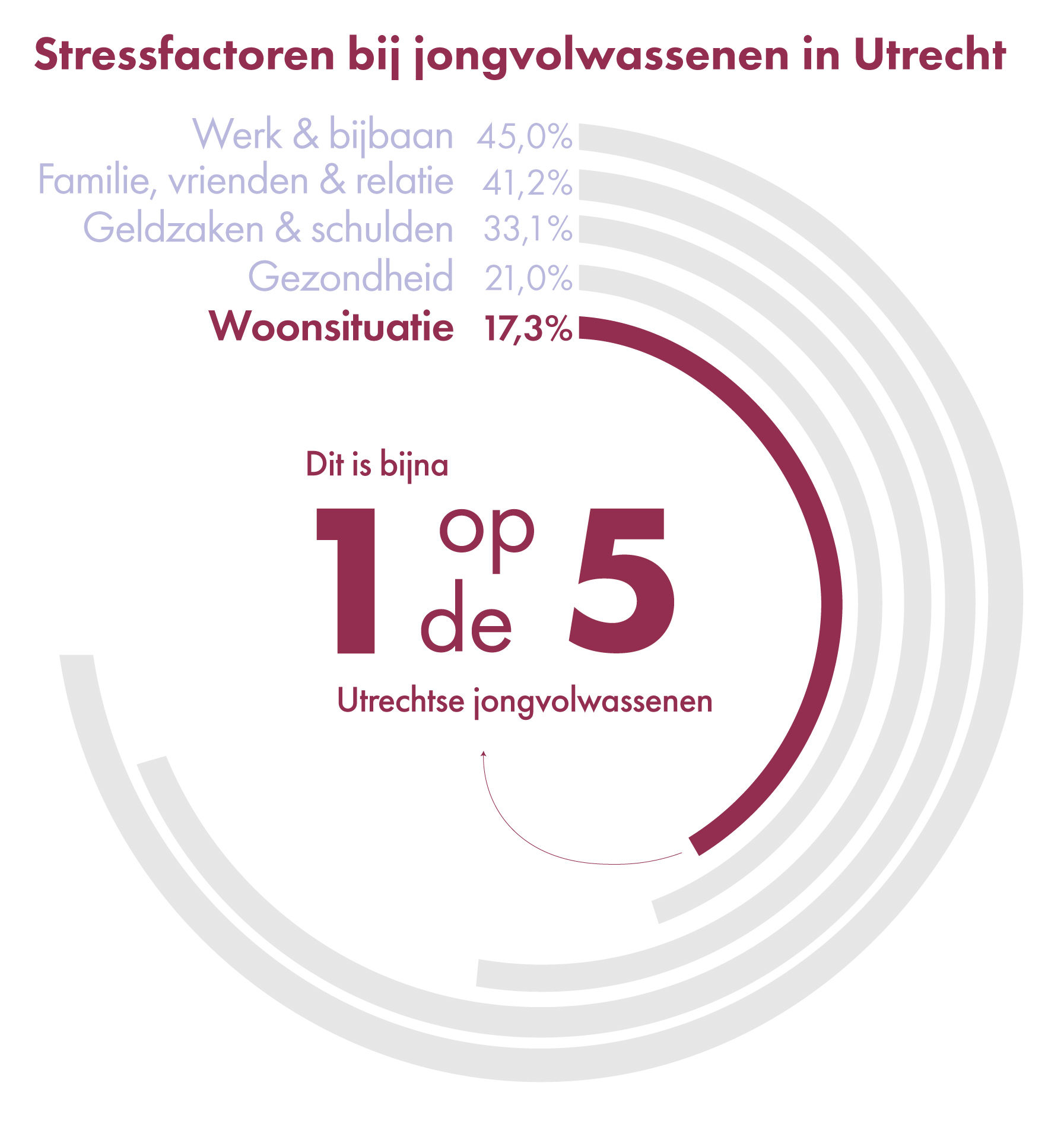 Onderzoek van het RIVM laat zien dat één op de vijf Utrechtse jongvolwassenen woonstress ervaart. Dit is minder dan verschillende andere stressfactoren, maar verschilt op één belangrijk punt: In tegenstelling tot een deadline of ruzie is woonstress geen tijdelijk probleem, maar een voortdurende spanning in het dagelijks leven. De druk om een geschikte en betaalbare woning te vinden, samen met de onzekerheid over de toekomst op dit vlak, kan sluipend en constant aanwezig zijn. Wanneer deze stress langdurig aanwezig is, kan dit volgens het UMC Utrecht grote gevolgen hebben voor de gezondheid.
