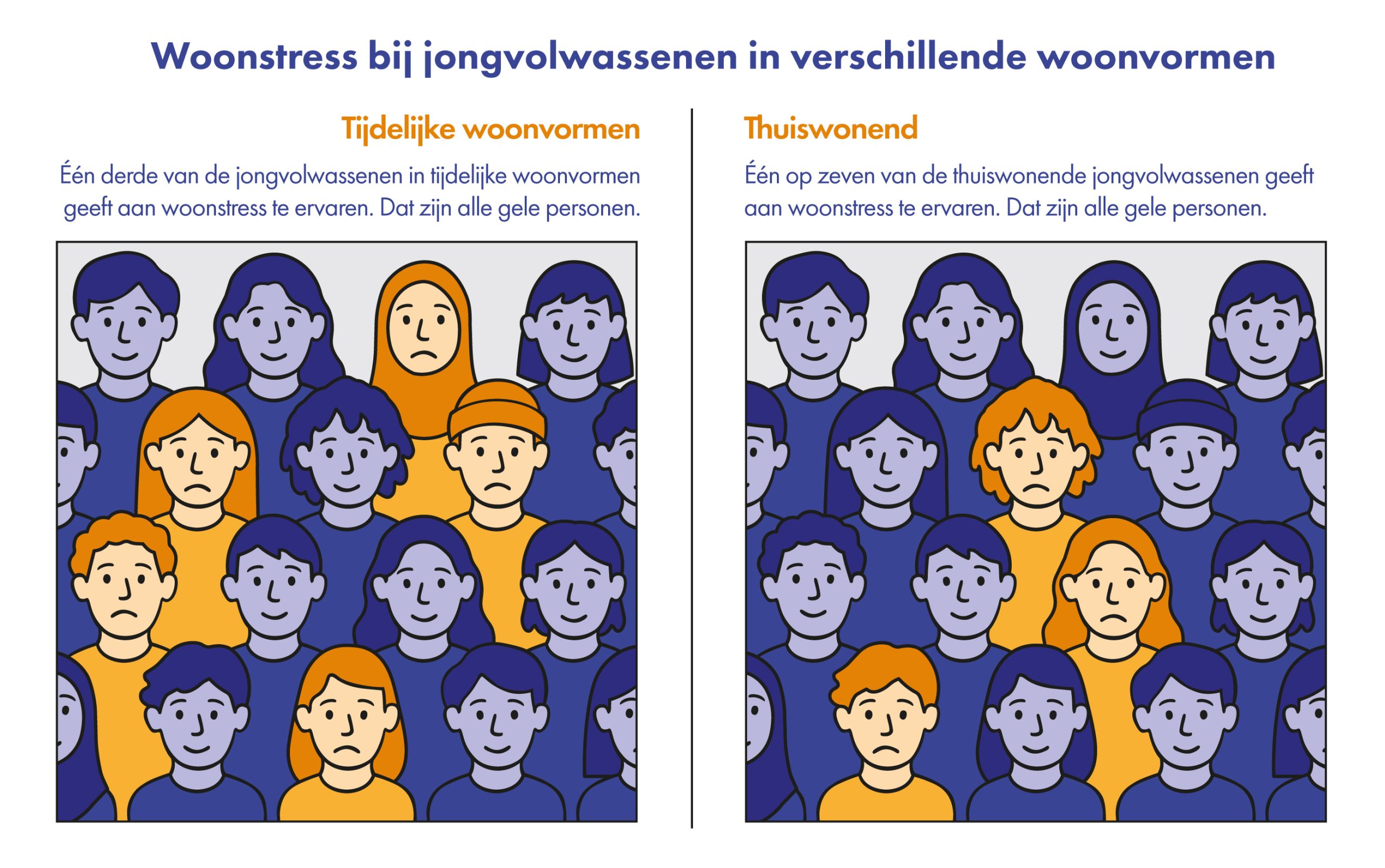 Daarnaast komen er uit de enquête duidelijke signalen naar voren over stress rondom het verlaten van de woonplek. Er wordt een helder verschil duidelijk tussen verschillende woonvormen. Bijna de helft van de jongeren die in een tijdelijke woonvorm verblijft (47,8%) maakt zich zorgen over het moment waarop zij hun huidige plek moeten verlaten. Onder jongeren die bij hun ouders wonen komt dit gevoel vrijwel niet voor; slechts 2,6% geeft aan hier stress van te ervaren. Dit benadrukt opnieuw hoe de onzekerheid die samenhangt met tijdelijke woonvormen een belangrijke bron van stress vormt in het dagelijks leven van veel jongvolwassenen.