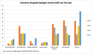 Opvallend is dat het aantal drugsdumpingen in de eerste helft van 2021 met bijna twee derde gestegen ten opzichte van dezelfde periode het jaar ervoor. Dat blijkt uit cijfers van het Europese meldprogramma ERISSP, in samenwerking met de Nederlandse politie. Uit de cijfers blijkt dat de stijging het grootst in Limburg. De toename komt door een grote hoeveelheid drugslabs die in Limburg opgespoord zijn. Dat is te zien op de tabel. Daarnaast is in de tabel te zien dat er in 2018 en 2019 sprake was van een piek aan drugsdumpingen in de Nederlandse natuur.