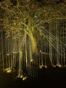 Kunstwerk op VONK: VERBINDING door Bart Ensing: een netwerk van verlichte draden verbindt de boom met zijn oorsprong: de aarde.