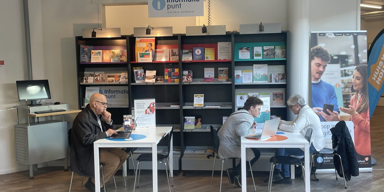 Het Informatiepunt Digitale Overheid in Bibliotheek Houten tijdens een druk bezocht spreekuur. Foto: Julian van der Tak.