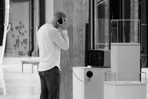 Listening to a Migration Story. A visitor listens to a recorded migrant story within the exhibition, emphasizing the personal voices behind broader migration debates. Photograph by Kim Elst, 2026.