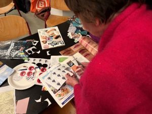 Surrounded by magazines, member Agaath cuts out feminist symbols to make buttons.
