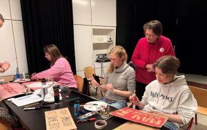 Inside a cultural center in Utrecht one can smell the scent of watercolors and markers. Tables are covered with scissors, colorful palettes and unfinished posters. In every corner of the room people sit together, chatting and sharing their ideas for the evening. Almost every week now the Dolle Minas are organizing an evening to get together across the Netherlands.
