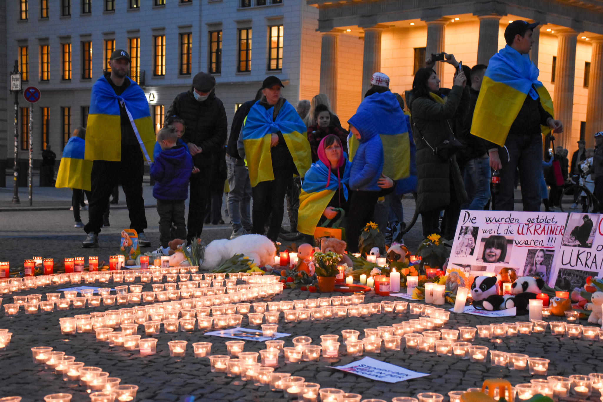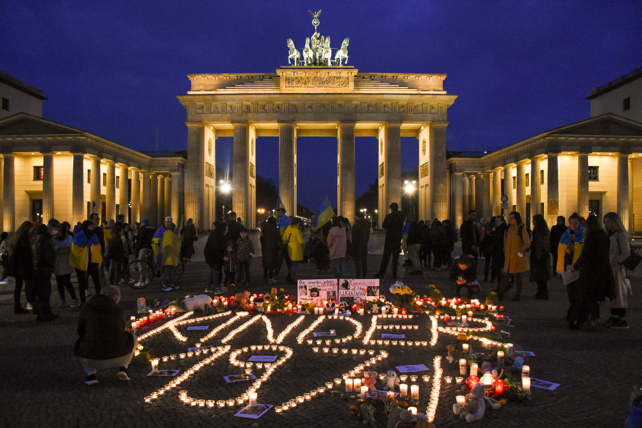 - People gather in front of the Brandenburger gate to think about the children who died during war.