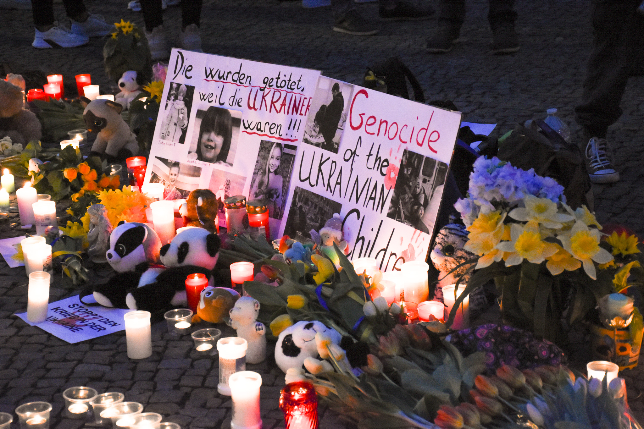 Not only people that host refugees or help at the train station show the welcoming vein and solidarity of the Berliners. Ukrainian flags are hung from balconies and windows all over Berlin. Demonstrations and manifestations are on the agenda in Berlin almost daily. A guitarist plays an Ukrainian song, people are waving Ukrainian flags behind him. Others are covered in flags. 197 children have already died in the war at this time. Little candles on the floor say so.
