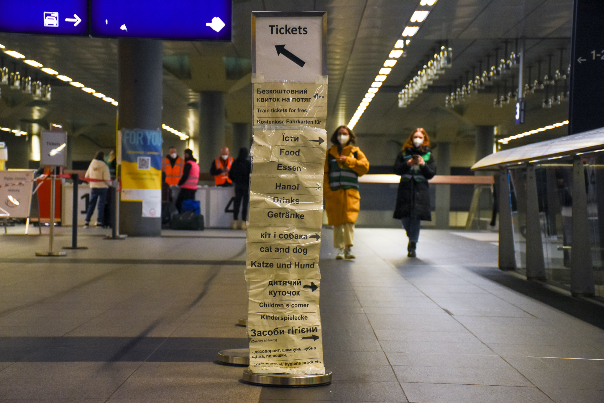 - Signs all over the train station guide refugees to the areas where the can get help.