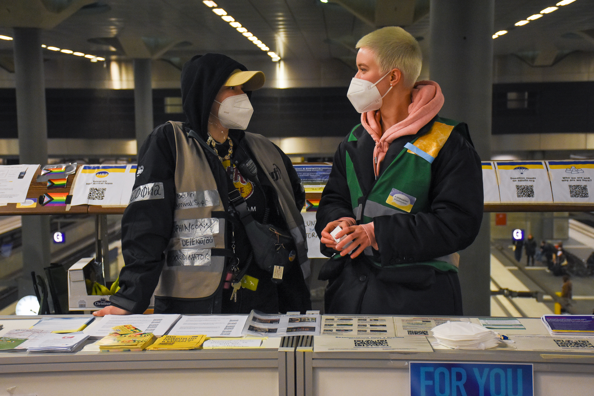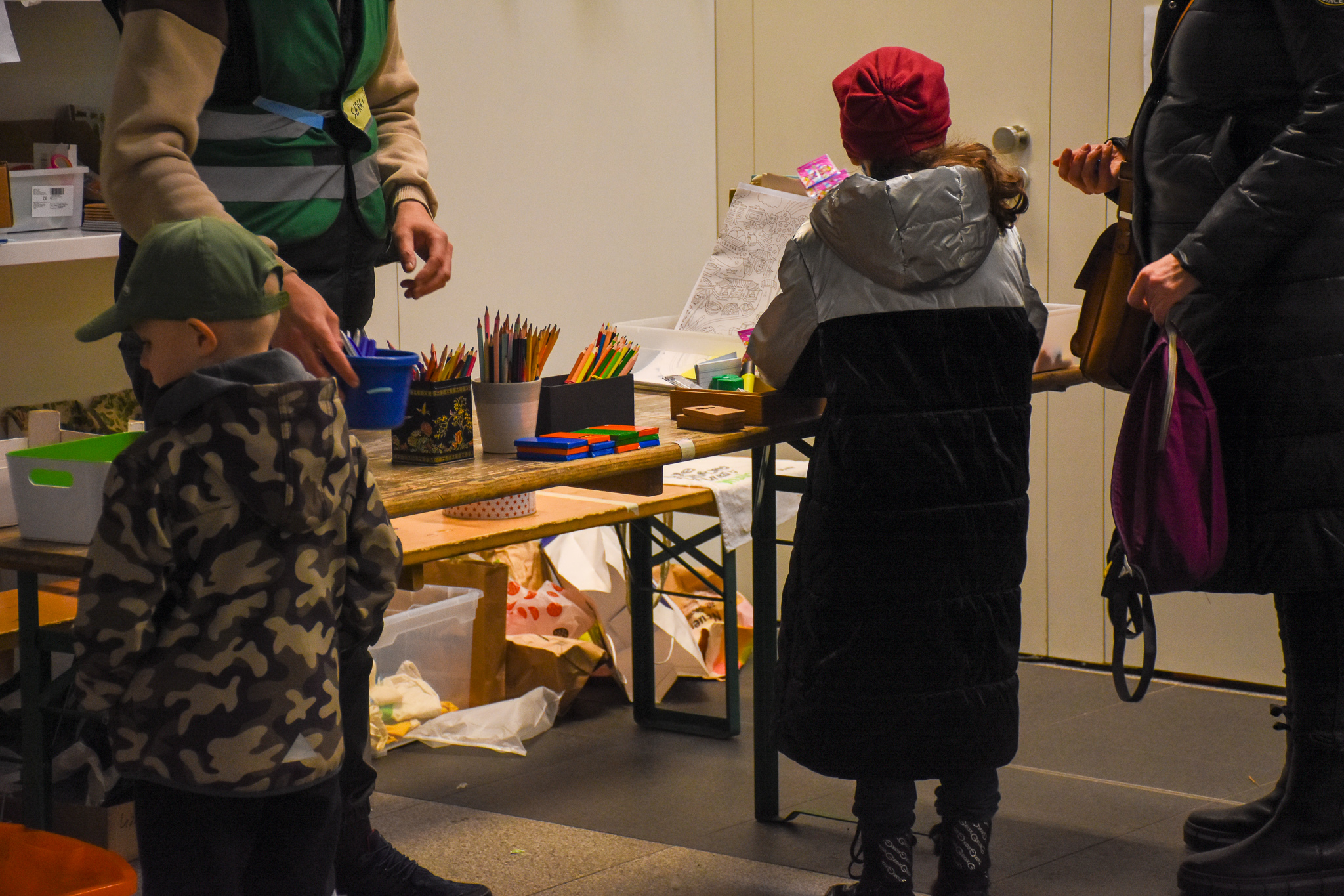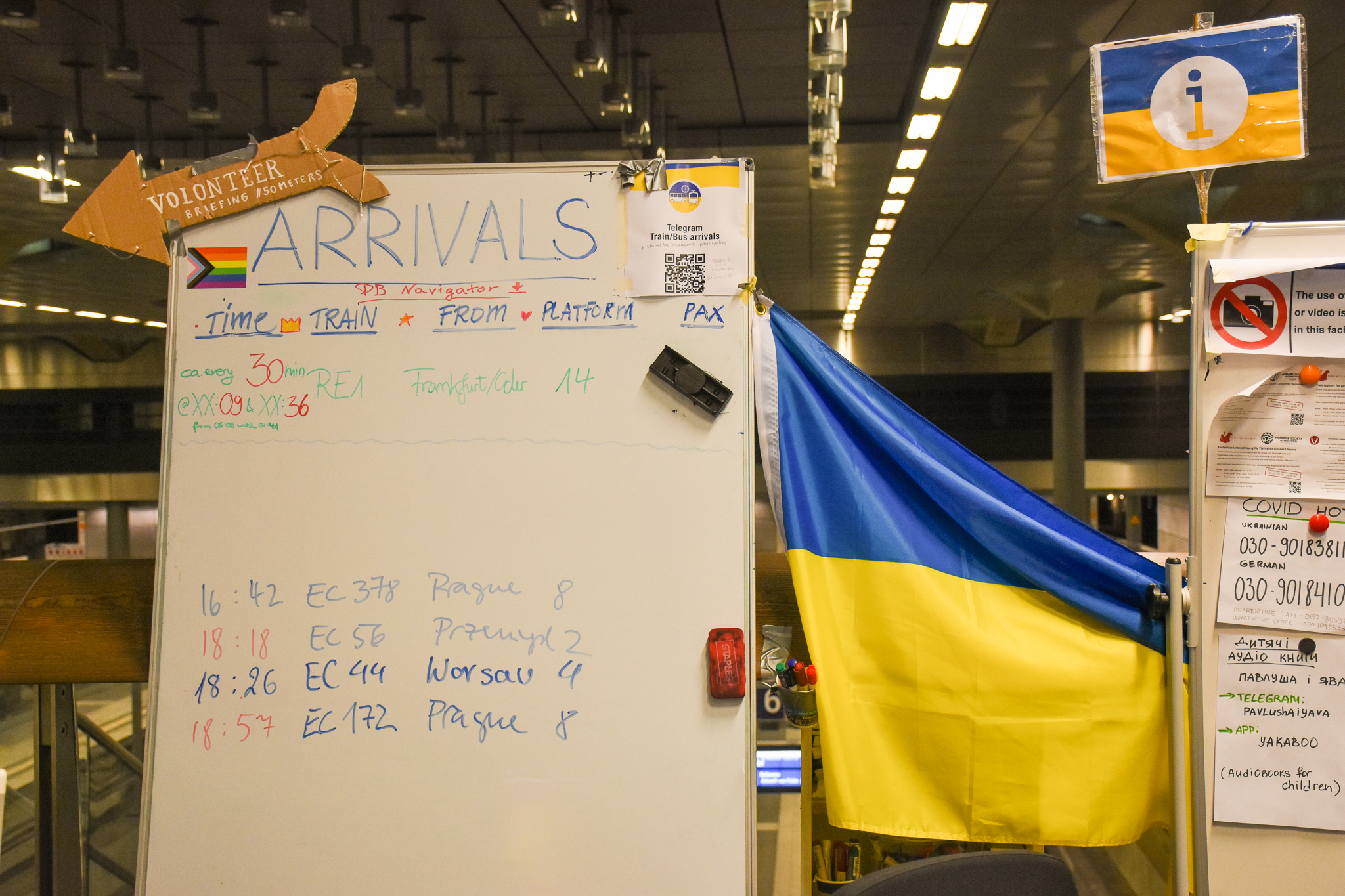 Following the signs down the corridor the refugees will find a “helping centre” where volunteers and employees of “Deutsche Bahn” await them already. On the left there are volunteers coaching new volunteers, followed by two stands of Deutsche Bahn where Ukrainian refugees get free ticket to travel to other parts of Germany. On the right side Children stand in front of a desk covered in toys, waiting for a volunteer to give them toys to play with and colours to draw. Free food and drinks are provided, volunteers provide flyers with further information and have conversations with families. All the volunteers have to be briefed and present a negative covid test when they want to help. A covid test station at the helping centre gives them the opportunity to get there test every day.