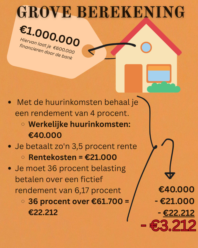 Rekenvoorbeeld met grove berekening over inkomsten en kosten op jaarbasis. Door: Jacqueline Prummel [let op: zo werkt het niet helemaal in werkelijkheid. Forfaitair rendement 2024 iets lager, maar daarnaast heb je nog kosten onderhoud. Verder moet je rekening houden met een forfaitaire rente, die is aftrekbaar. Overigens ligt werkelijke rente van 5 of 6 procent veel meer voor de hand dan 3,5%]