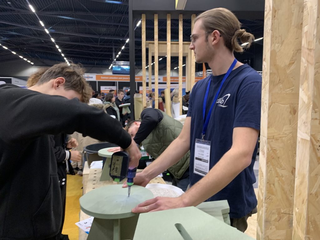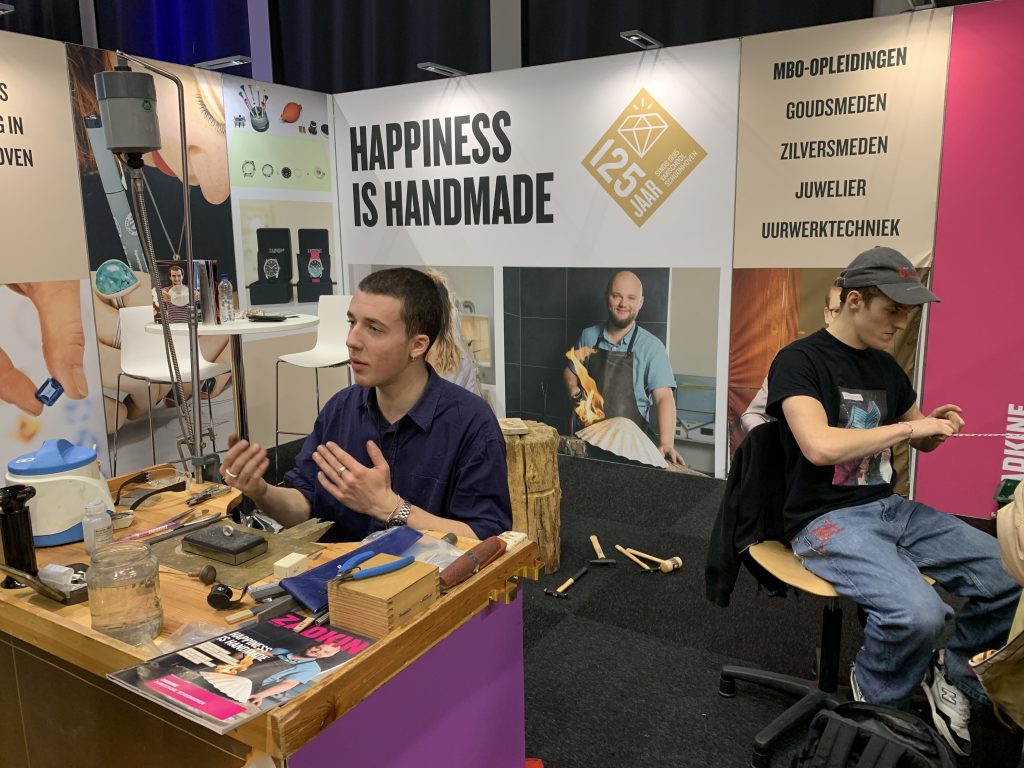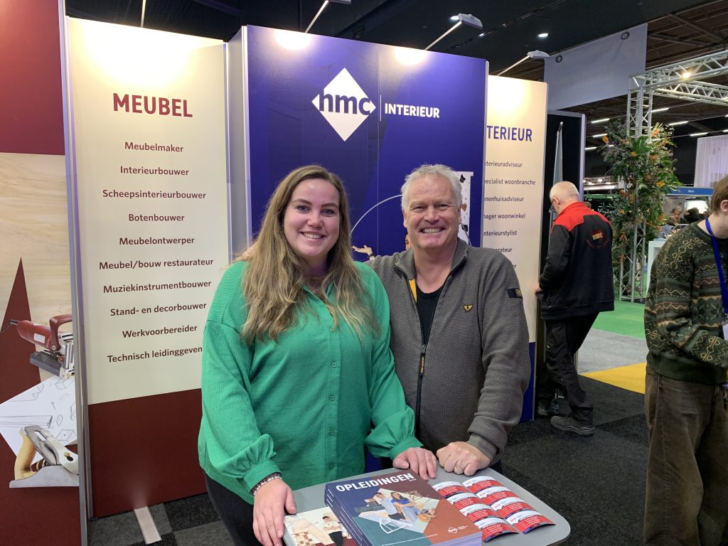 “Wij proberen het mbo aantrekkelijker te maken door het te laten zien,” vertelt Sabrina Vlot van het Hout- en Meubileringscollege. “Zo staan we vandaag op de beurs met allerlei attributen. Je kunt bij ons je eigen laminaat leggen, krukjes maken en schilderen. Een paar jaar geleden hadden we alleen een flyer. Scholieren zien nu dus echt dat je bij ons leert werken. Je gaat meteen de praktijk in, en dat is precies waar we ze proberen te raken.”