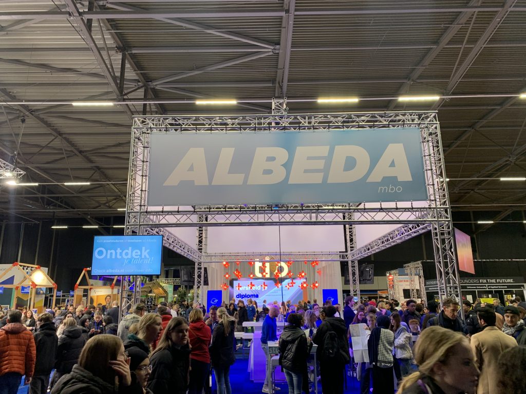 Het was een drukte van jewelste op vrijdag 8 december tijdens de opleidingenbeurs in Ahoy. De grote grijze loods was voor de gelegenheid omgetoverd tot een gezellige beurs met kraampjes. Bij elk kraampje kun je terecht voor informatie over verschillende opleidingen, zoals de sportopleiding CIOS, de Amsterdam Fashion Academy of het Eurocollege. Meer dan 90 onderwijsinstellingen en bedrijven waren aanwezig. Er was op de beurs voor ieder wat wils: veel mbo- en hbo-opleidingen, maar ook enkele wo-opleidingen. Bij elk kraampje stonden minstens twee vertegenwoordigers enthousiast te vertellen over hun opleiding. Bij Albeda en de TIO-opleidingen stonden zelfs twintig mensen in bijpassende T-shirts om bezoekers naar hun kraampje te lokken.