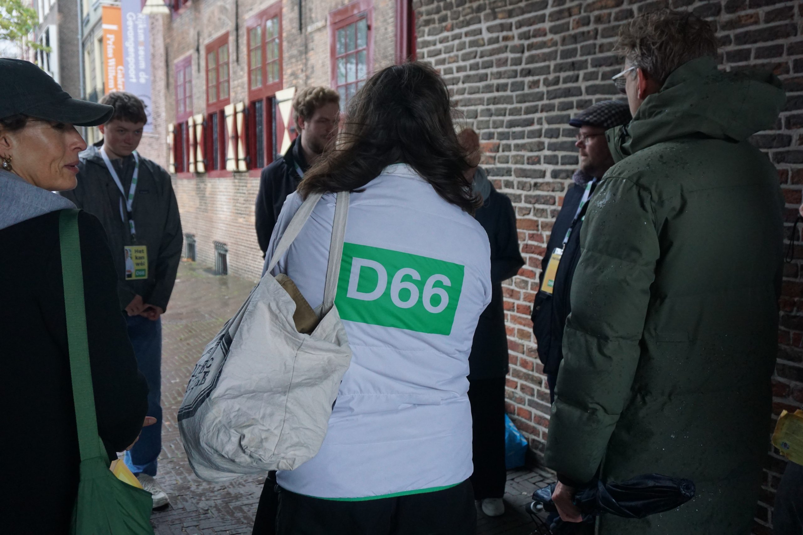 Onder de bogen van de Gevangenpoort, schuilend voor de regen, verzamelen zich D66-vrijwilligers en raadsleden. Ondanks de aanval lijkt de sfeer onder de vrijwilligers opvallend positief.