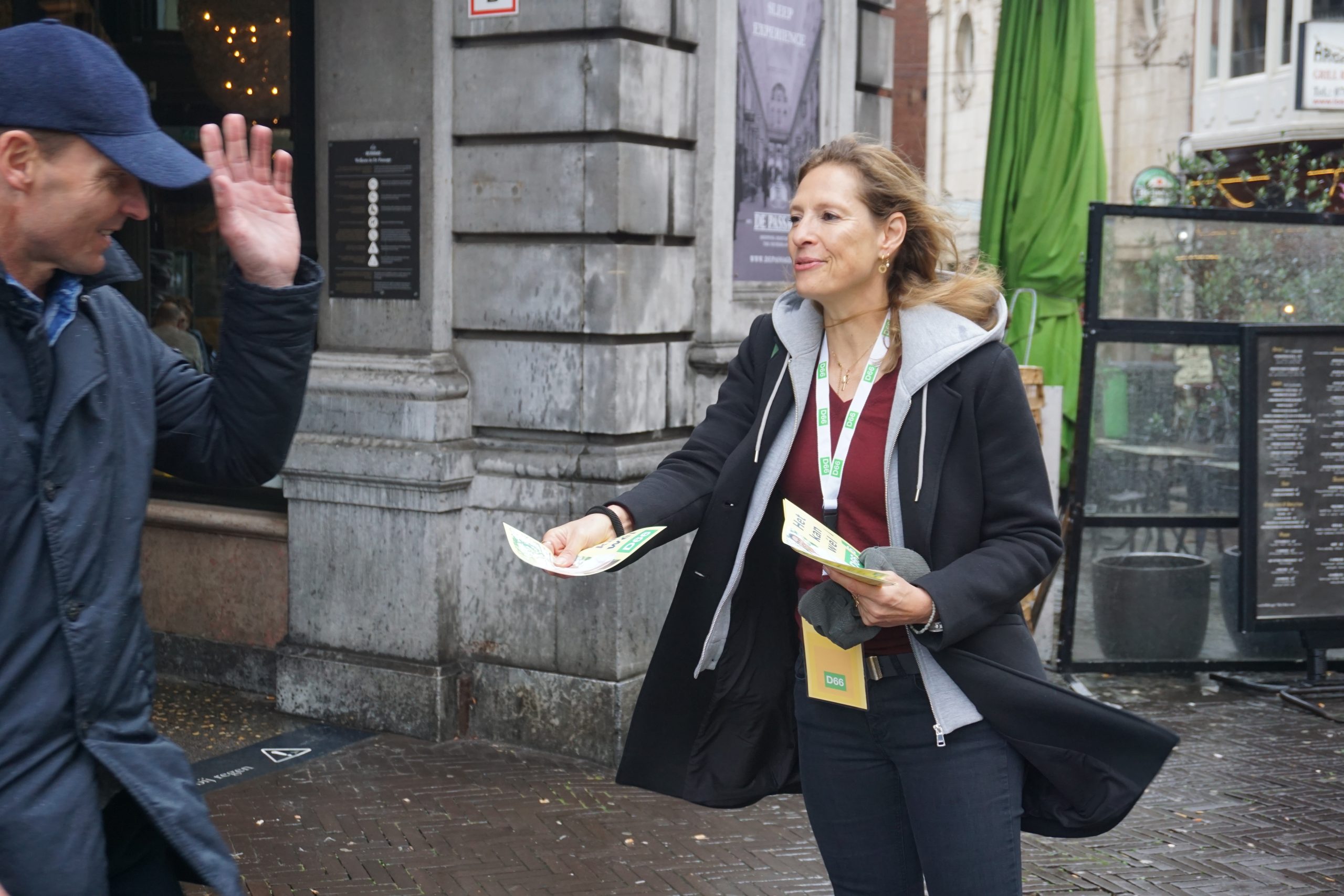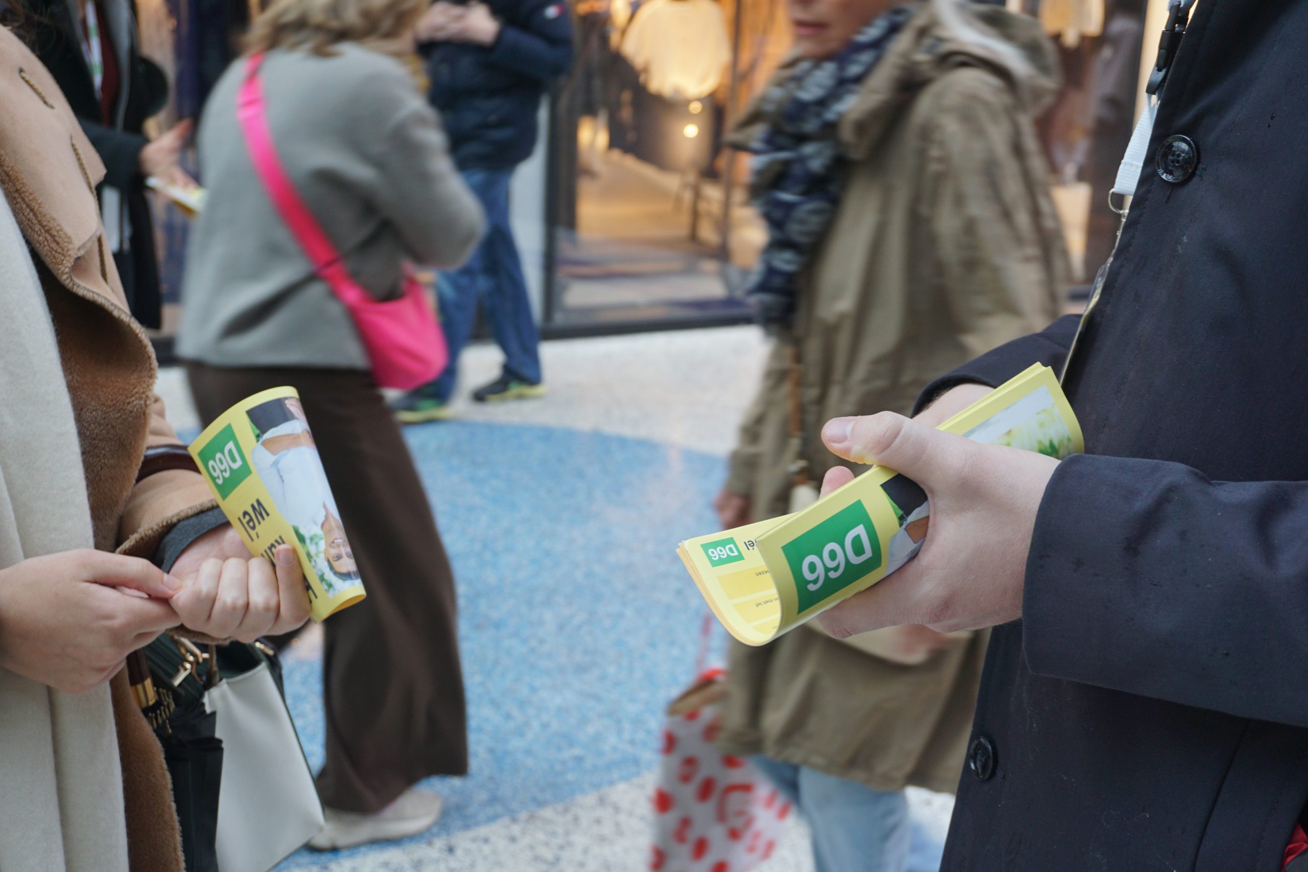 Verderop in de drukte van de Passage staan ook vrijwilligers, met hun stapel flyers al ongeveer gehalveerd. Ze knikken naar voorbijgangers en blijven glimlachen als iemand zijn hand afwerend opsteekt. De glimlach wordt nog breder als ze af en toe horen: “Ik ga al op jullie stemmen!”
