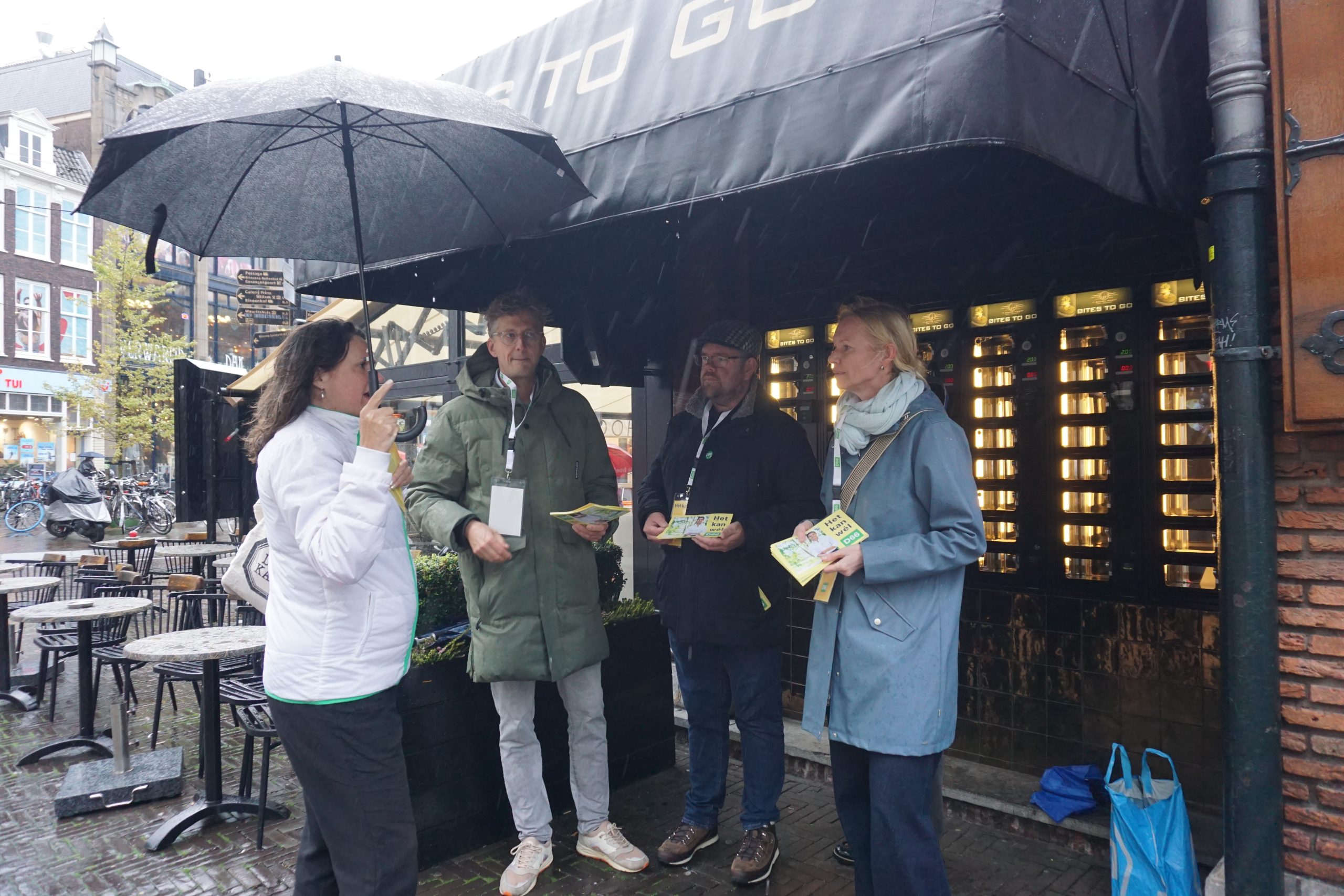 Iets verder in de stad, onder de luifel bij de automatiek bij ’t Goude Hooft, staan de rest van de D66’ers even te schuilen voor de regen.