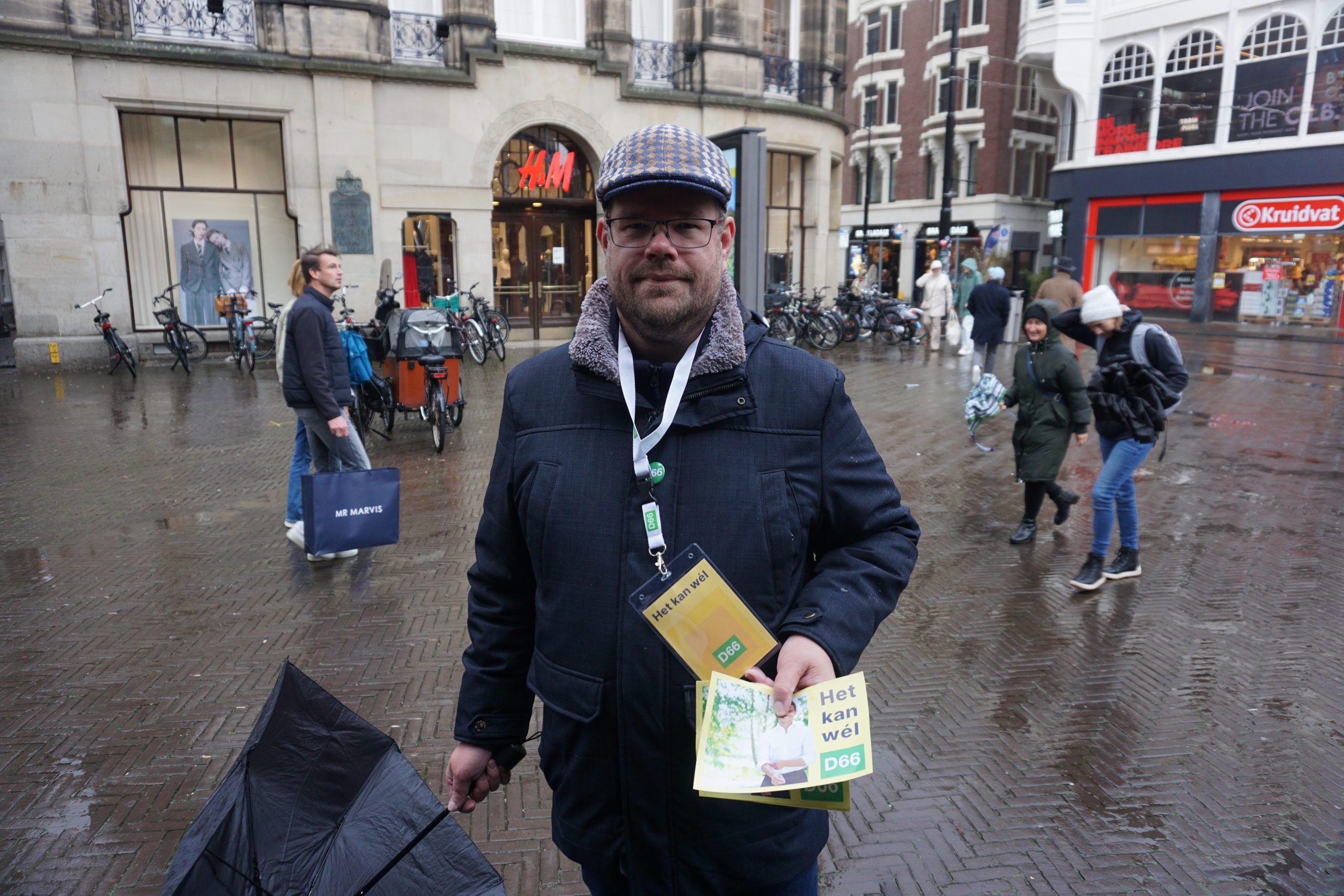 Bob, die al een tijdje actief is bij D66, stapt even opzij richting een etalage. “Of ik verschil zie in intimidatie? In 2017 had ik nauwelijks ergens last van. Daarna is het wel opgelopen. Tussen de vorige verkiezingen en nu zit voor mij weinig verschil. Af en toe hoor je ‘leugenaar’, maar het blijft bij woorden.”