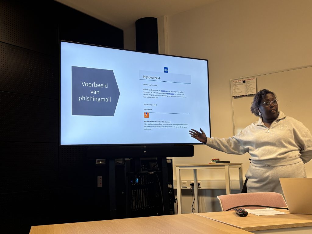 Jama staat naast het digibord, waar een presentatie te zien is. Ze werkt in de bibliotheek en geeft daarnaast de cursus Veilig Online. ‘Vanuit de gemeente Almere zijn wij gevraagd dit te verzorgen.’ Volgens Jama is de aanleiding duidelijk. ‘Digitale oplichting is een groot probleem.’ Met de lessen wil ze inwoners van Almere bereiken die zich onzeker voelen achter een scherm.