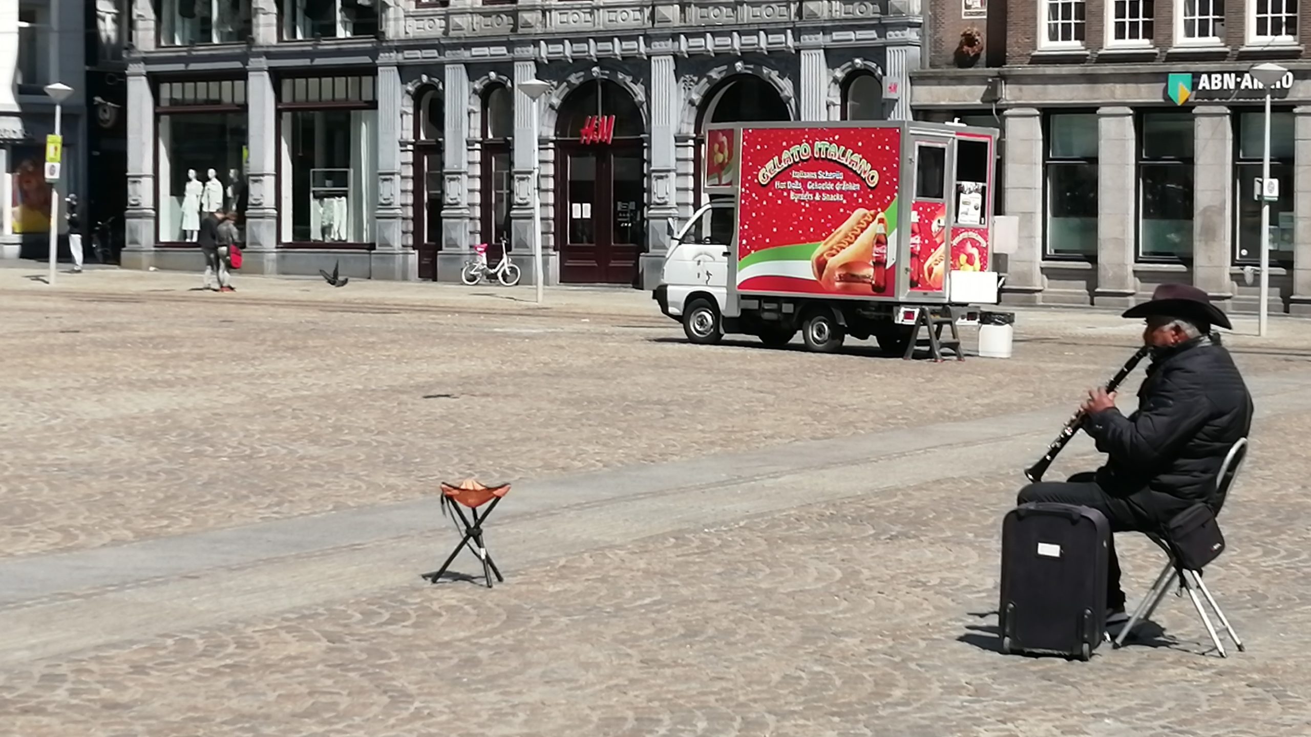 Aan de rand van het plein zit een straatmuzikant. Een in zwart gehulde man met cowboyhoed en klarinet. Hij mist een aantal tanden en zegt dat hij geen Nederlands spreekt. Hij zit op een stoeltje met op anderhalve meter van hem vandaan een centenbakje op pootjes wat veel weg heeft van een campingkrukje in miniatuur. Het centenbakje is leeg. Man met de klarinet: “Ik spreek geen Nederlands, wel Russisch en Servisch. Ik verdien vijftien tot twintig euro per dag als ik geluk heb. Ik woon nu zeven jaar in Nederland.”. De man met de klarinet verduidelijkt dit door zeven vingers in de lucht te steken, waarbij zijn pink een beetje gebogen staat. Het Nederlands komt er wat gebrekkig uit, maar de woorden die hij spreekt zijn verstaanbaar. De kerkklokken galmen nog steeds over het plein heen. Wanneer de kerkklokken zijn opgehouden klinkt er muziek uit zijn klarinet. Een jongen loopt op hem af en werpt mutjes in het bakje. De man met de hoed knikt vriendelijk.