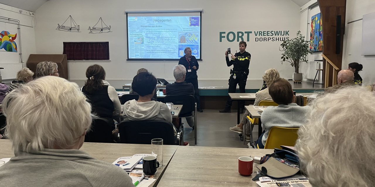 Rond tien voor half twee stroomt het vol in het dorpshuis in Fort Vreeswijk. Er is een ontspannen sfeer en inwoners van Vreeswijk gaan vrolijk in gesprek met de politieagenten. Door de drukte worden er extra tafels bijgezet, een grote opkomst van mannen vrouwen, veelal boven de zeventig. Bleeker, de zeventigjarige IT-er, vertelt achteraf dat hij na zijn pensioen nog wat voor de mensheid wilde betekenen, dus staat hij al drie jaar dit soort workshops te geven. Vooral om oudere bewoners van Nieuwegein en omstreken digitaal te ondersteunen.