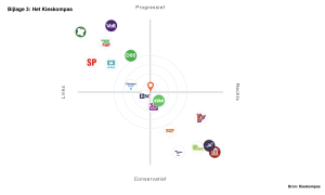 Vervolgens is er gekeken naar het aandeel rechtse en linkse partijen in de lijst van bijlage 2. Om een duidelijke definitie van rechts en links per partij te hebben, is er gekeken naar het Kieskompas (Bijlage 3). Partijen die dicht bij het midden liggen, zoals het CDA, heb ik meegerekend als middenpartij. Kleinschalige partijen bevinden zich niet op het Kieskompas, echter is het op basis van informatie van het Documentatiecentrum Nederlandse Politieke Partijen mogelijk om deze partijen de titel links of rechts te geven. Uit deze verdeling blijkt dat de scholieren op zes linkse partijen hebben gestemd, oftewel ongeveer 33,33% van de totale uitslag. Door deze zetels bij elkaar op te tellen om het aandeel van rechtse partijen te berekenen, blijkt 56% van de zetels aan rechtse partijen toe te behoren. Om dit vervolgens te kunnen vergelijken met het stemgedrag van volwassenen is er gekeken naar de verkiezingsuitslag van het ANP, deze zijn vervolgens in een tabel gezet door de NOS