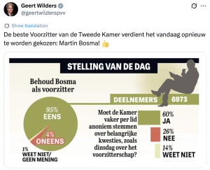 De ochtend voorafgaand aan de verkiezing voor de nieuwe Kamervoorzitter heeft Geert Wilders een tweet geplaatst waarin hij het laat lijken alsof 95% van de mensen wilden dat Martin Bosma herkozen zou worden als voorzitter. Echter komt de peiling die hij aanhaalt van De Telegraaf, wat suggereert dat de respondenten van de peiling een rechtse politieke voorkeur hebben. Dat maakt de tweet van Wilders misleidend, en niet representatief voor de rest van Nederland.
