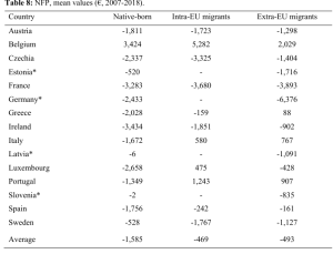 Als je kijkt naar de EU is er vooral data te vinden tussen 2007 tot 2018. In een onderzoek naar migratie in de EU is er te zien dat migranten minder negatieve fiscale posities hebben dan de inheemse bevolken van de Europese landen. Wat dus ook de claim dat immigranten in Europa meer geld kosten ook ontkracht.