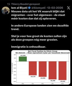 Op 12 februari 2026 plaatst Iem al Biyati, voorzitter van JFvD, een bericht op X (voormalig Twitter) met ‘nieuwe’ data uit het Verenigd Koninkrijk wat aantoont dat immigranten – over het algemeen – de overheid meer geld kost dan oplevert en dat ze deze trend ook steeds vaker in andere landen zien. De data die getoond wordt is uit 2023/24 en laat de netto fiscale positie per etnische groep zien, dit geeft aan hoeveel een bepaalde etnische groep gemiddeld méér aan belastingen en premies betaalt dan zij aan overheidsuitgaven ontvangt of juist andersom. De data die zij op X deelt heeft geen bron vermeld.