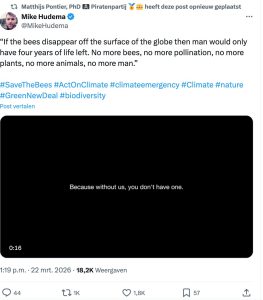 Op 22 maart 2026 publiceert Mike Hudema, een Canadese milieuactivist, de volgende claim op X: ‘Als de bijen van het aardoppervlak verdwijnen, dan zou de mens nog maar vier jaar te leven hebben.’ Zijn post is herplaatst door de politieke partij de Piratenpartij. Over welke bijen het gaat en waar hij deze informatie vandaan haalt, is onduidelijk. Ik heb dit gevraagd aan Hudema, maar nog geen reactie ontvangen. Klopt deze uitspraak wel?