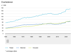 – Met de vergrijzing neemt ook het jaarlijks aantal overledenen toe.