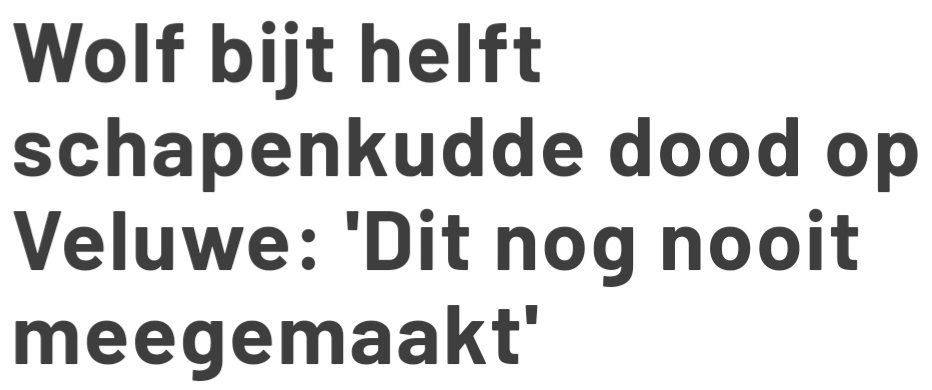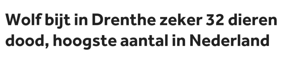 NOS. (2022, 31 oktober). Wolf bijt in Drenthe zeker 32 dieren dood, hoogste aantal in Nederland. NOS.nl. https://nos.nl/artikel/2450554-wolf-bijt-in-drenthe-zeker-32-dieren-dood-hoogste-aantal-in-nederland