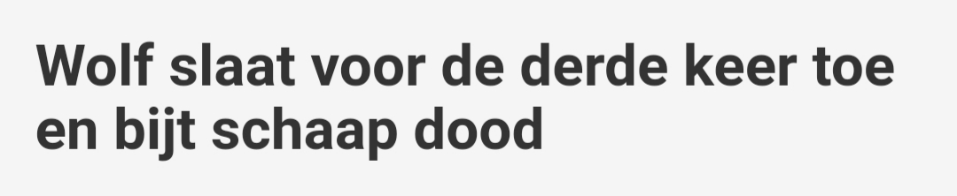 gelrenieuws.nl. (2022, 17 december). Wolf slaat voor de derde keer toe en bijt schaap dood. GelreNieuws.nl. Geraadpleegd op 25 januari 2023, van https://www.gelrenieuws.nl/2022/12/wolf-slaat-voor-de-derde-keer-toe-en-bijt-schaap-dood.html