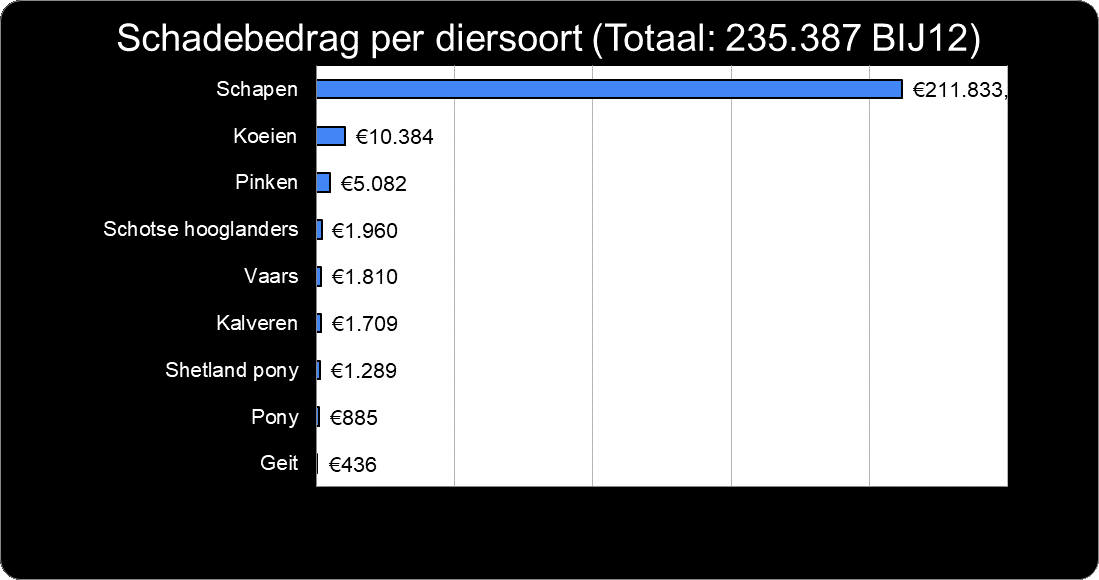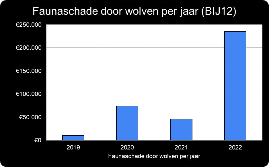 - Dit zijn de kosten per jaar aan faunaschade door de wolf, volgens BIJ12. Hoewel dit een heel klein is van de totale faunaschade is er met uitzondering van 2021 een toenemende trend.