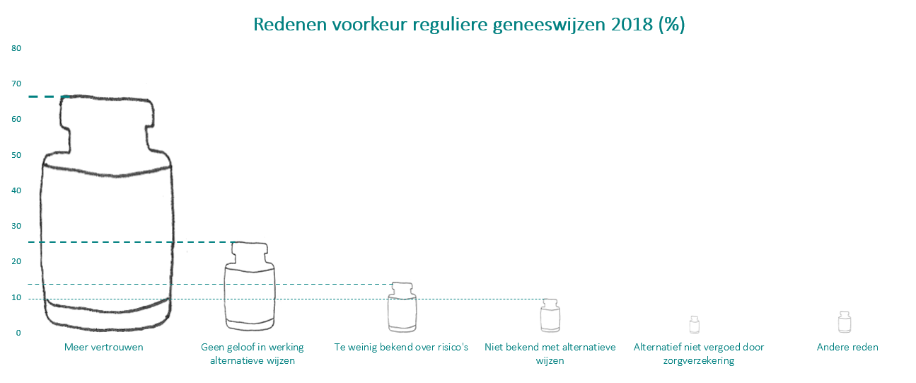 Ongeveer 67% van de respondenten heeft meer vertrouwen in reguliere behandelingen. Meer dan 20% heeft zelfs geen vertrouwen in de werking van ‘het alternatieve’.