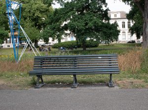 Ambtenaren met leren aktetassen lopen het gemeentehuis uit. Kregting wijst naar een stalen constructie; een bankje, zogenaamd.