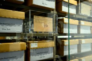 In een andere vitrine liggen de kaarten van de Joodse Raad Cartotheek. “Ik heb de mijne nog,” zegt hij. “Maar er staan vier jaren niet op. De jaren dat ik ondergedoken zat. In het kadaster stond ik gewoon als vermist.” Zijn adem stokt terwijl hij vertelt. Dan zegt hij bijna fluisterend: “Wist je dat ik dit nog nooit eerder aan iemand heb verteld?”